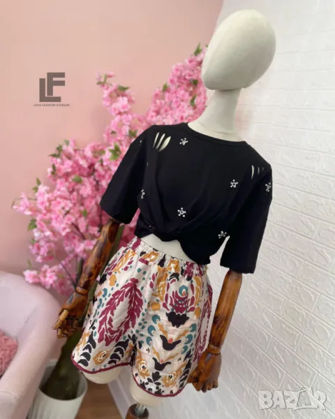 Кройка: Сет от две части. Тениската е свободена, права, скъсена . Панталонките са с висока талия, ластик на кръста