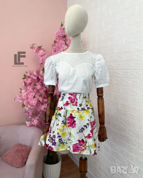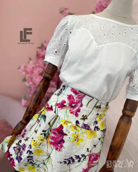 Кройка: Кройката на блуата е свободна, права, декорирана с красива дантела. Кройката на пола/панталонът е свободна, с висока талия