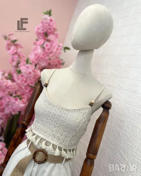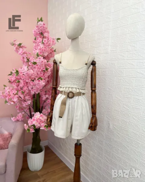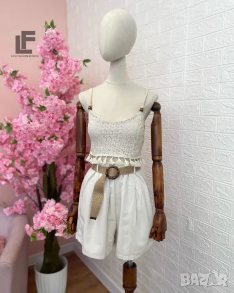Кройка: Сет от 3 отделни части. Топът е скъсен с ластик на гърба. Панталоните са с ластик в кръста и коригиращ колан