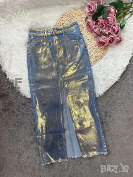 Кройка:Кройката е хитова за сезона с висока талия и ефектна ръчно нанесена боя