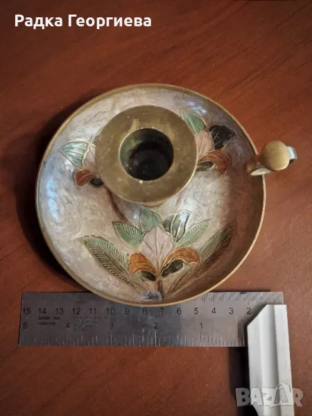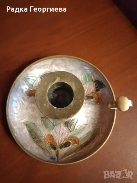 Винтидж месингов свещник с дръжка и емайлиран дизайн.