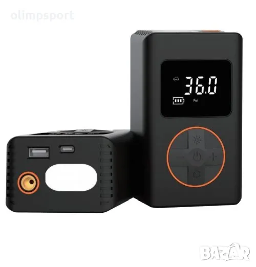 Акумулаторен мини компресор , подходящ за помпане на различни видове гуми (на автомобили, велосипеди) с вентили тип Schrader и Dunlop, топки (футболни, баскетболни, волейболни, хандбални, гимнастически и други), балони, както и надувни помощни средства за водни спортове. Функция за показане на налягането в реално време на дисплея и за предварителен избор на целево налягане, при достигане на което помпаненето се прекъсва автоматично. Комплектът съдържа най-често срещаните накрайници - игла за топка, накрайник за гимнастически топки и надувни помощни средства за водни спортове, накрайник за вентил Dunlop, накрайник за балони. Вградената LED светлина подобрява видимостта на работната зона. Комплектът съдържа също USB кабел с дължина 30 см (Type-A – Type-C) и потребителска картонена кутия.