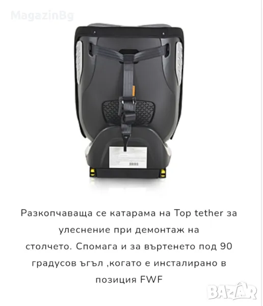 - Бързо освобождаване на горната лента - Top tether чрез катарама за допълнително улеснение монтаж и демонтаж на столчето;