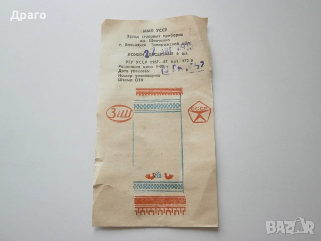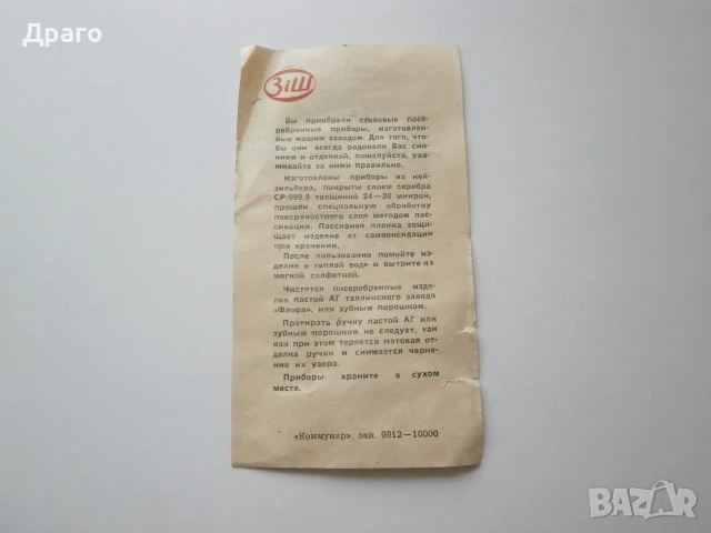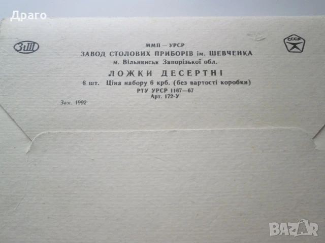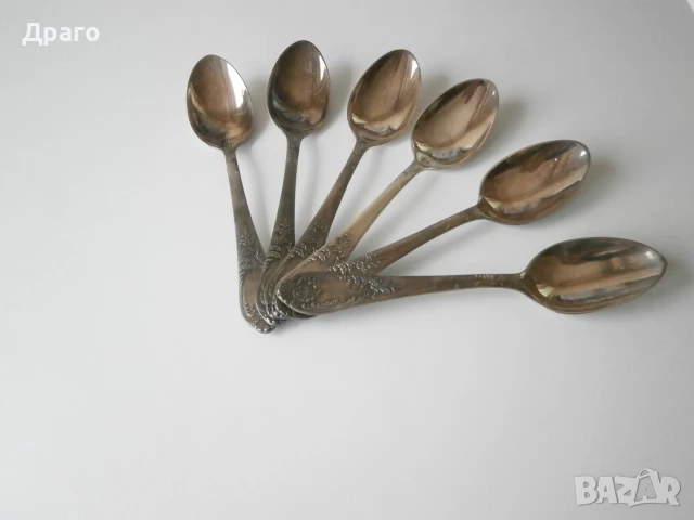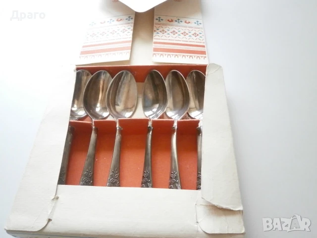 Нови посребрени шест броя руски лъжици с дължина 18см.Комплекта е с маркировка и е произведен 1975г. в завода ЗiШ.Приборите не са ползвани и не са третирани и се предлагат в оригиналната си кутия.Цената не се коментира.