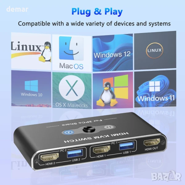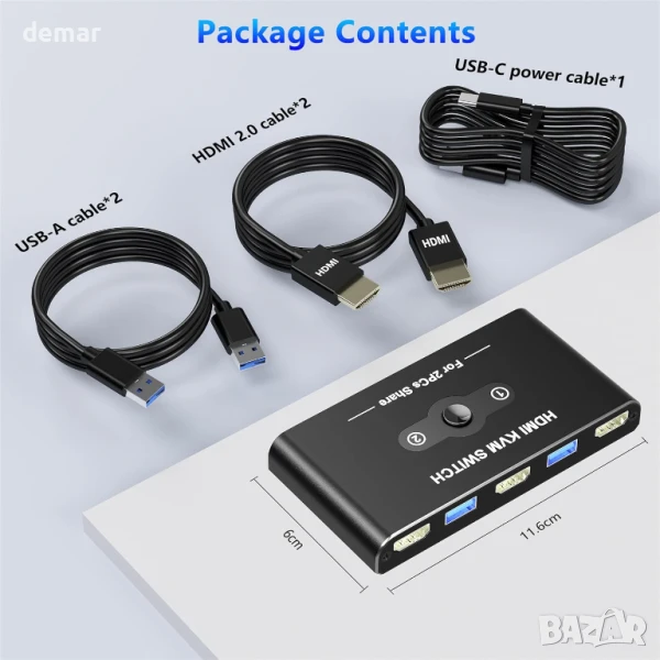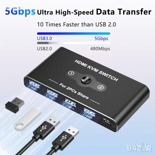 Този KVM превключвател ви позволява да управлявате два компютъра, използвайки един монитор, клавиатура, мишка и USB устройства, което помага за намаляване на хаоса от кабели и рационализиране на работното ви място. Той поддържа ултраясен 4K@60Hz видео изход (съвместим и с по-ниски резолюции) и включва четири USB 3.0 порта за бърз трансфер на данни до 5Gbps, подходящи за различни периферни устройства. Предоставен е USB-C захранващ кабел за стабилна работа, въпреки че не е включен външен захранващ адаптер. Превключването между компютрите отнема 2–5 секунди, а LED индикатор показва активния източник. Не се поддържа превключване с клавишни комбинации.