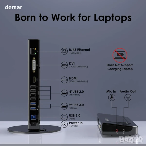 Тази 13-в-1 докинг станция предлага два видео изхода (HDMI и DVI), множество USB портове (2 x USB 3.0, 4 x USB 2.0), аудио/микрофон, ethernet и се предлага с полезни адаптери, включително USB A-C, DVI-VGA и DVI-HDMI. Тя поддържа разширени или огледални дисплеи до два 1080p или един 1440p плюс един 1080p, което я прави идеална за офис работа и многозадачност (не за игри или възпроизвеждане на видео). Съвместима е с повечето Mac (включително M1/M2) и Windows лаптопи чрез USB 3.0 или Thunderbolt 3/4 и работи с Chrome OS, Android и Harmony OS - с изключение на Linux, Ubuntu и iPadOS. Забележка: не зарежда хост компютъра.