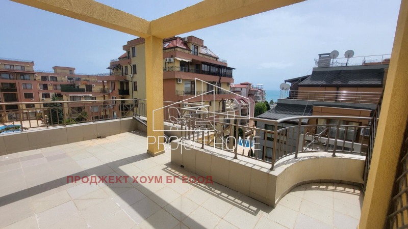 Предлага се за продажба светъл и уютен тристаен апартамент, разположен на пети етаж в затворен жилищен комплекс в Свети Влас, само на 150 метра от плажа. Общата площ на апартамента е 74 кв.м, а неговото основно предимство е просторната тераса от 60 кв.м с прекрасна морска гледка.