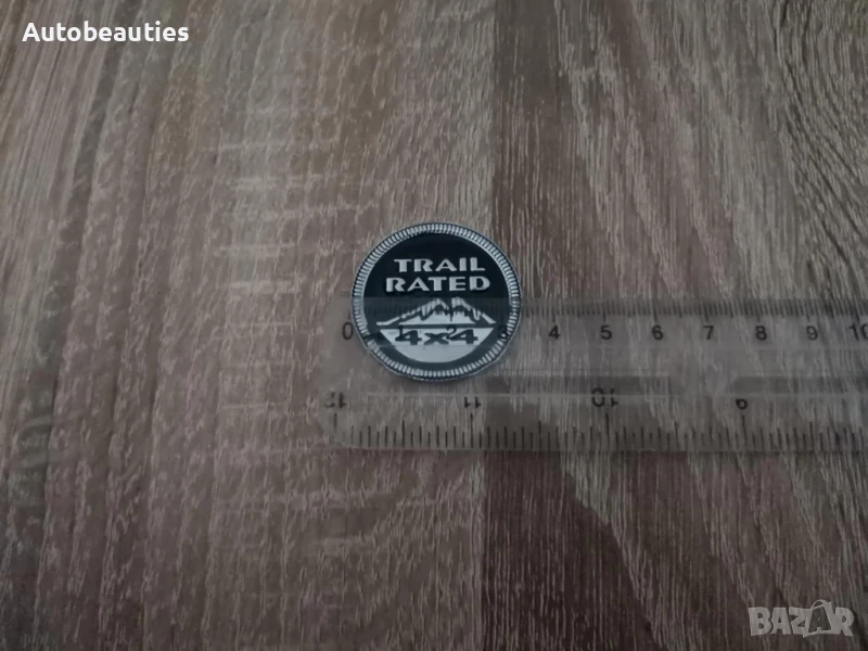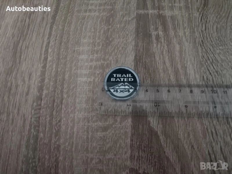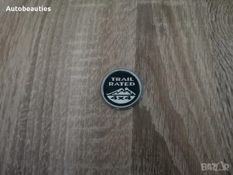 нова черна метална кръгла емблема за модела Trailrated на Jeep. Диаметърът е около 3.5 см