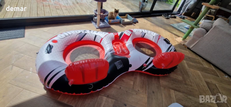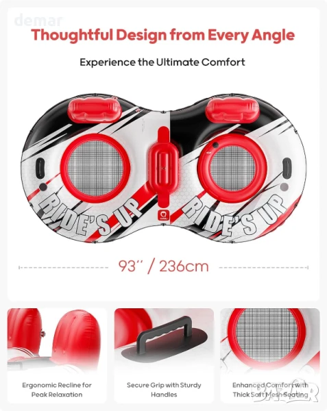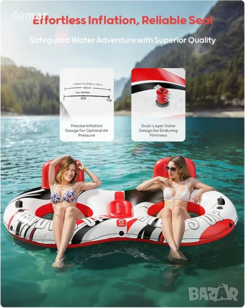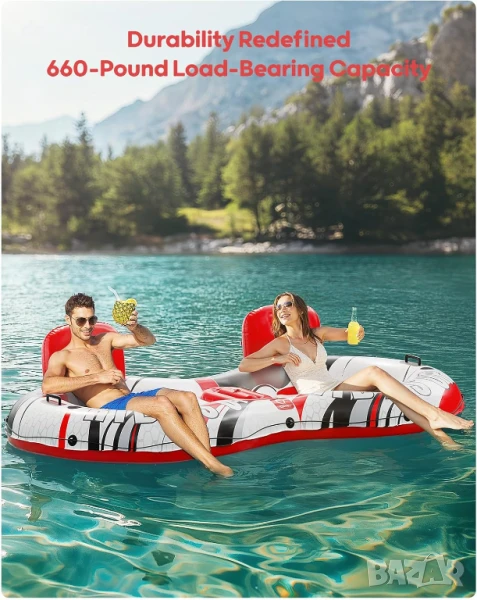 Изработен от дебел, устойчив на пробиване PVC, този здрав дюшек издържа до 270 кг и предлага просторен 273 см дизайн за мързелуване. Той разполага с подвижна възглавница, ергономична облегалка и меко мрежесто дъно за допълнителен комфорт. Вградените дръжки, покритата охладителна чанта и двойните поставки за чаши добавят удобство, докато двуслойният вентил и включеният манометър за напомпване осигуряват лесно и сигурно надуване. Теглещото въже улеснява свързването или издърпването, а дюшекът се сгъва бързо за компактно съхранение и пътуване.