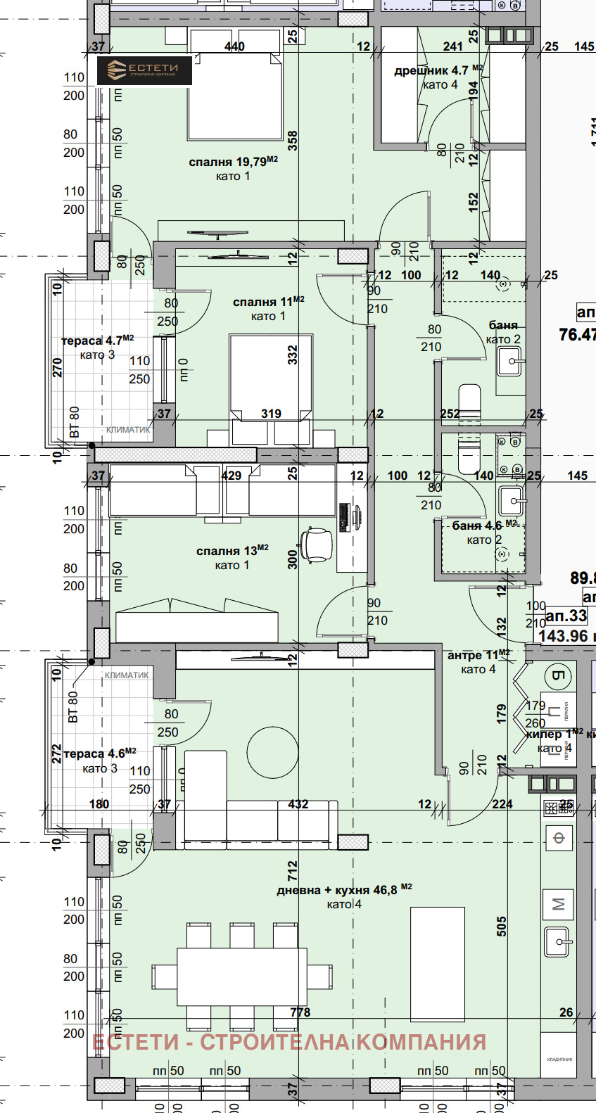 🏠Многостаен апартамент, състоящ се от: антре, дневна с кухня, 3 спални, 2 бани с тоалетна, килер, 2 тераси. Квадратура - 178 кв.м.