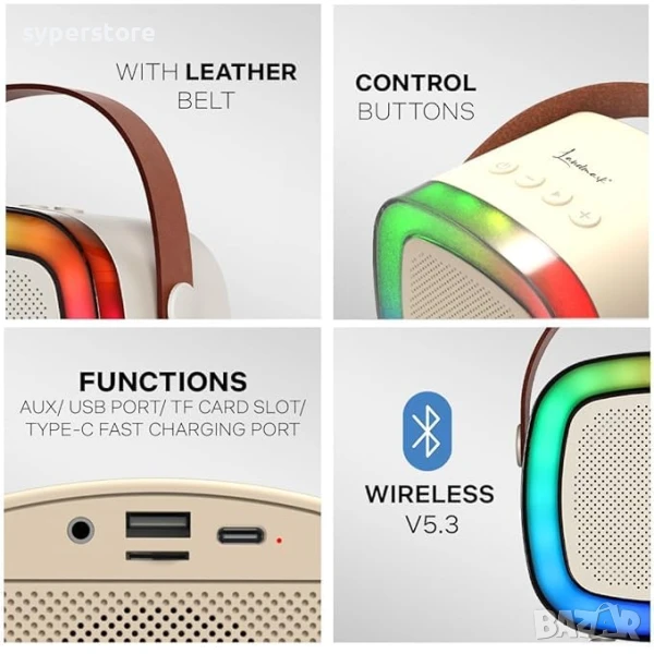 【Ярки LED светлини и разнообразни функции】 Караоке машината разполага с ослепителни и цветни LED светлини, които се синхронизират с музиката, създавайки визуално завладяващо изпълнение. Освен това, караоке машината предлага набор от разнообразни функции, включително Bluetooth свързаност, професионални аудио ефекти, гласова модулация и звукови ефекти на ниво KTV, осигурявайки безкрайни възможности за забавление.