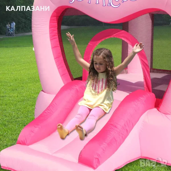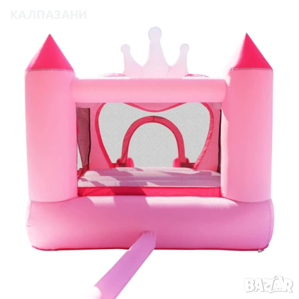 Надуваемият замък Happy Hop с коронка е перфектното място, където малките принцеси могат да се насладят на кралско забавление на открито. Този очарователен розов замък с дизайн на корона носи радостта от скачането и спускането по пързалка директно в градината.