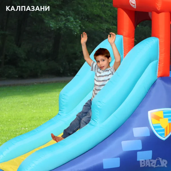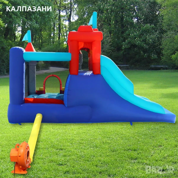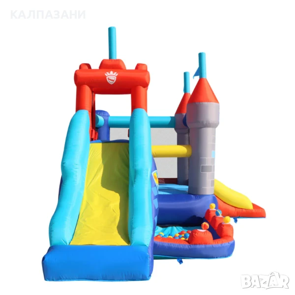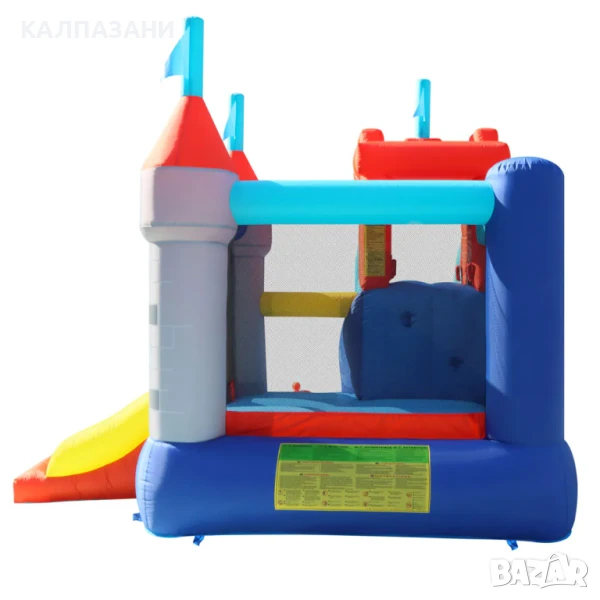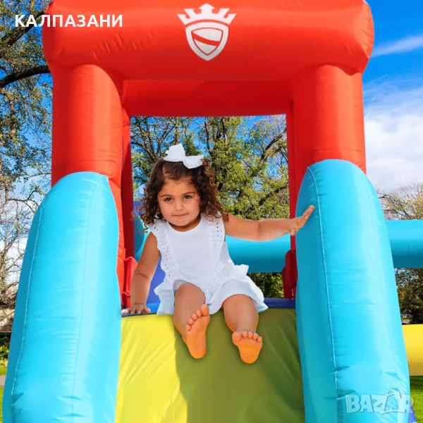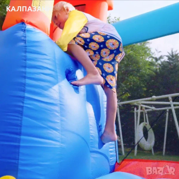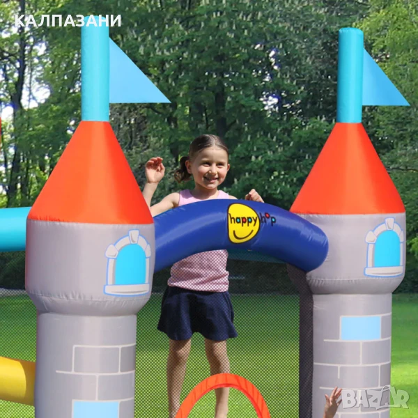 Надуваемият батут замък за игра на Happy Hop е идеалният избор за активни деца, които обичат да играят навън! Със своята цветна и забавна конструкция, този батут ще добави вълнение и забавление във всяка градина, двор или зона за игра на открито. Батутът разполага с няколко различни нива и зони, които предлагат разнообразие от активности, като басейн с топки и две пързалки на различна височина.