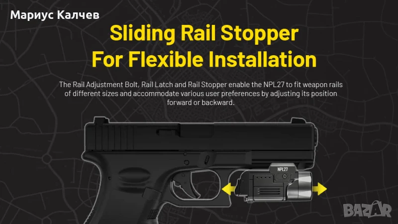 Nitecore NPL27 е компактен тактически фенер за монтаж на релса, който предлага невероятен обхват на осветяване до 410 метра и максимална яркост от 650 лумена. С пиков интензитет на лъча от 42 000 кандели, NPL27 осигурява интензивен лъч и достатъчно мощ, предлагайки ясна видимост на близко и далеч. Инсталирането на NPL27 е лесно, просто подравнете ограничителя на релсата с жлеба за откат на релсата и плъзнете NPL27 напред или назад до желаната позиция. Включен е адаптер за релса за допълнителна гъвкавост. NPL27 разполага с превключвател за лява и дясна ръка, подходящ както за левичари, така и за десничари. Той предлага два режима на осветление: висок и слаб, като същевременно