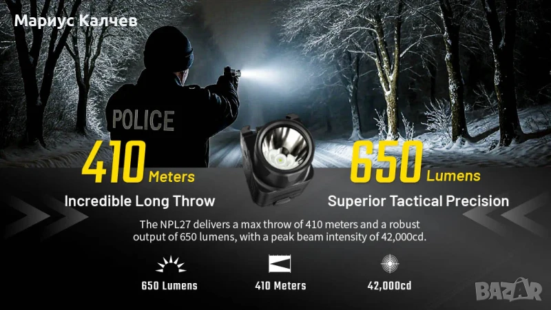Тактически прожектор за пистолет NITECORE NPL27, 410 метра, ЧИСТО НОВ