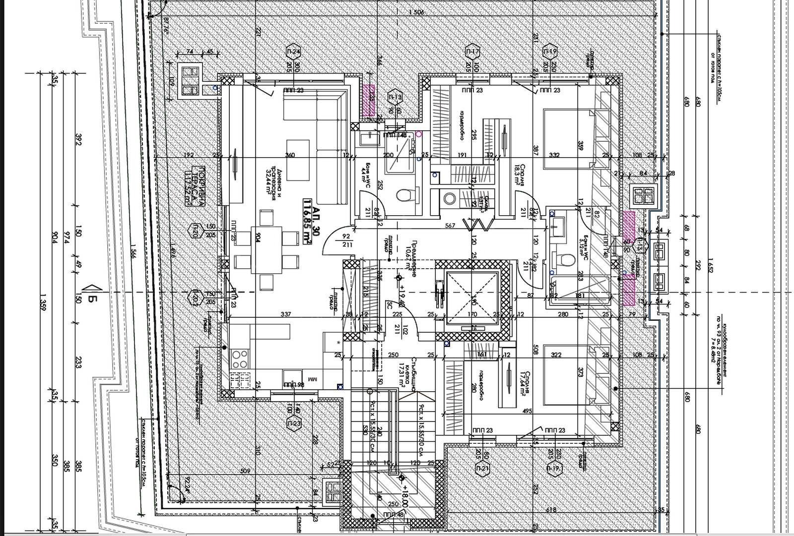 Имотът е с обща площ от 261.33 кв.м (нетна площ - 116.85 кв.м + общи части - 20.02 кв.м + покривна тераса - 117.52 кв.м + мазе - 6.94 кв.м) и е разположен на 7-и жилищен етаж.