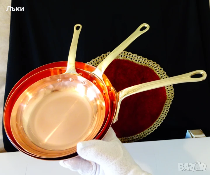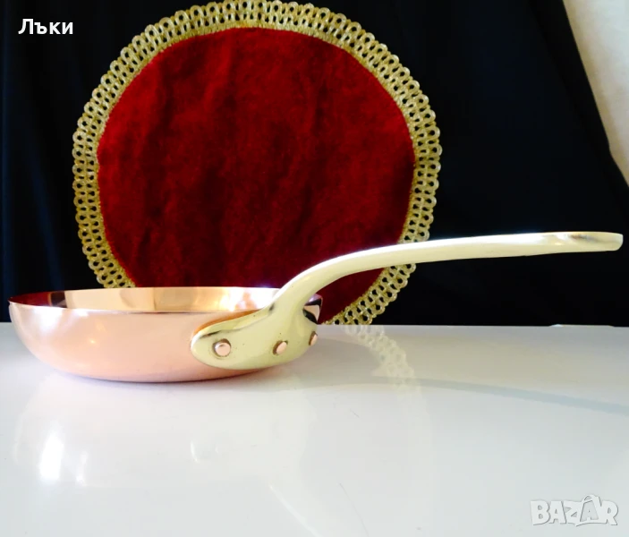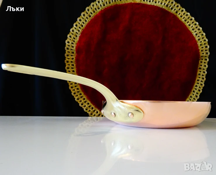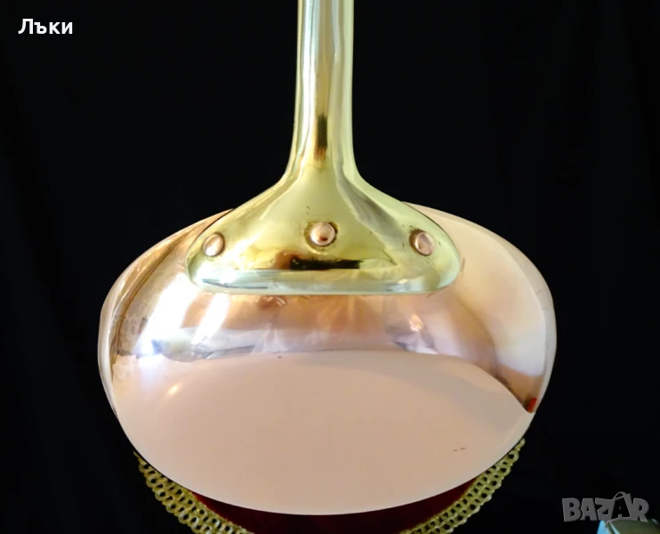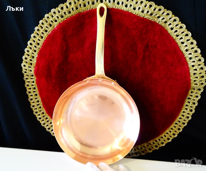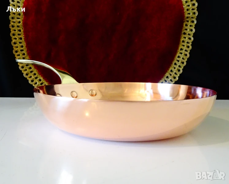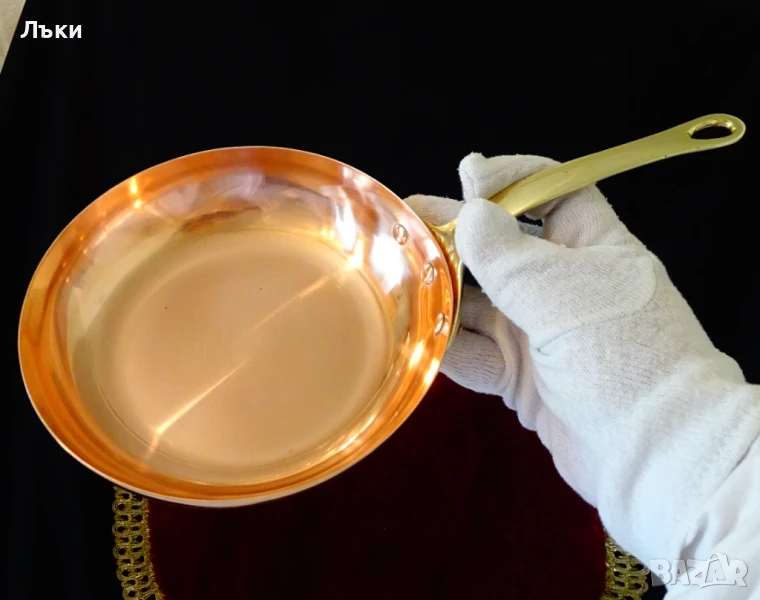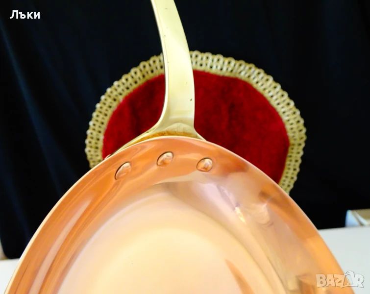 тиган с адски масивна бронзова дръжка,стабилно занитена за съда с три медни