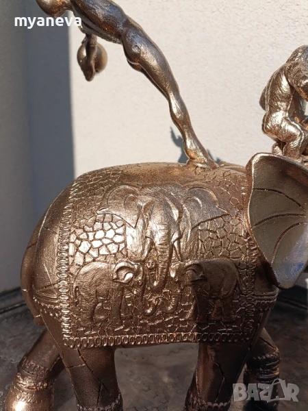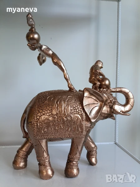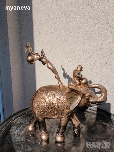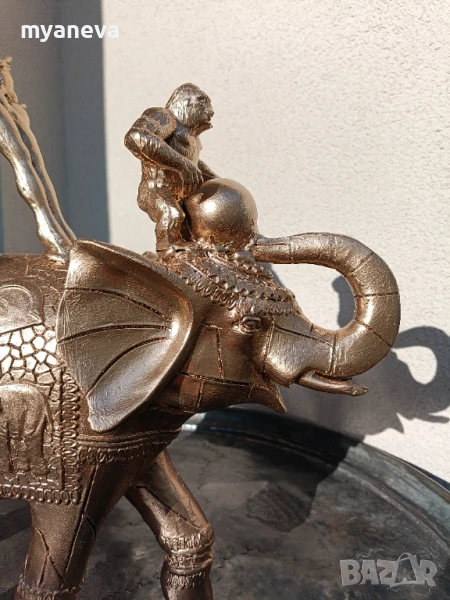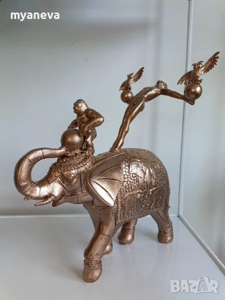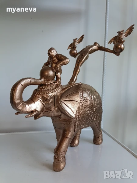 Тази изящна композиция изобразява акробат, балансиращ майсторски върху величествен слон, докато закачлива маймунка свири на барабан, а мъдри бухали пеят.