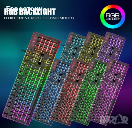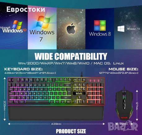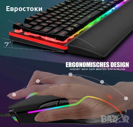 геймърски комплект: клавиатура + мишка + мека поставка за китка, RGB подсветка, анти-ghosting, 7D 7200 DPI мишка.