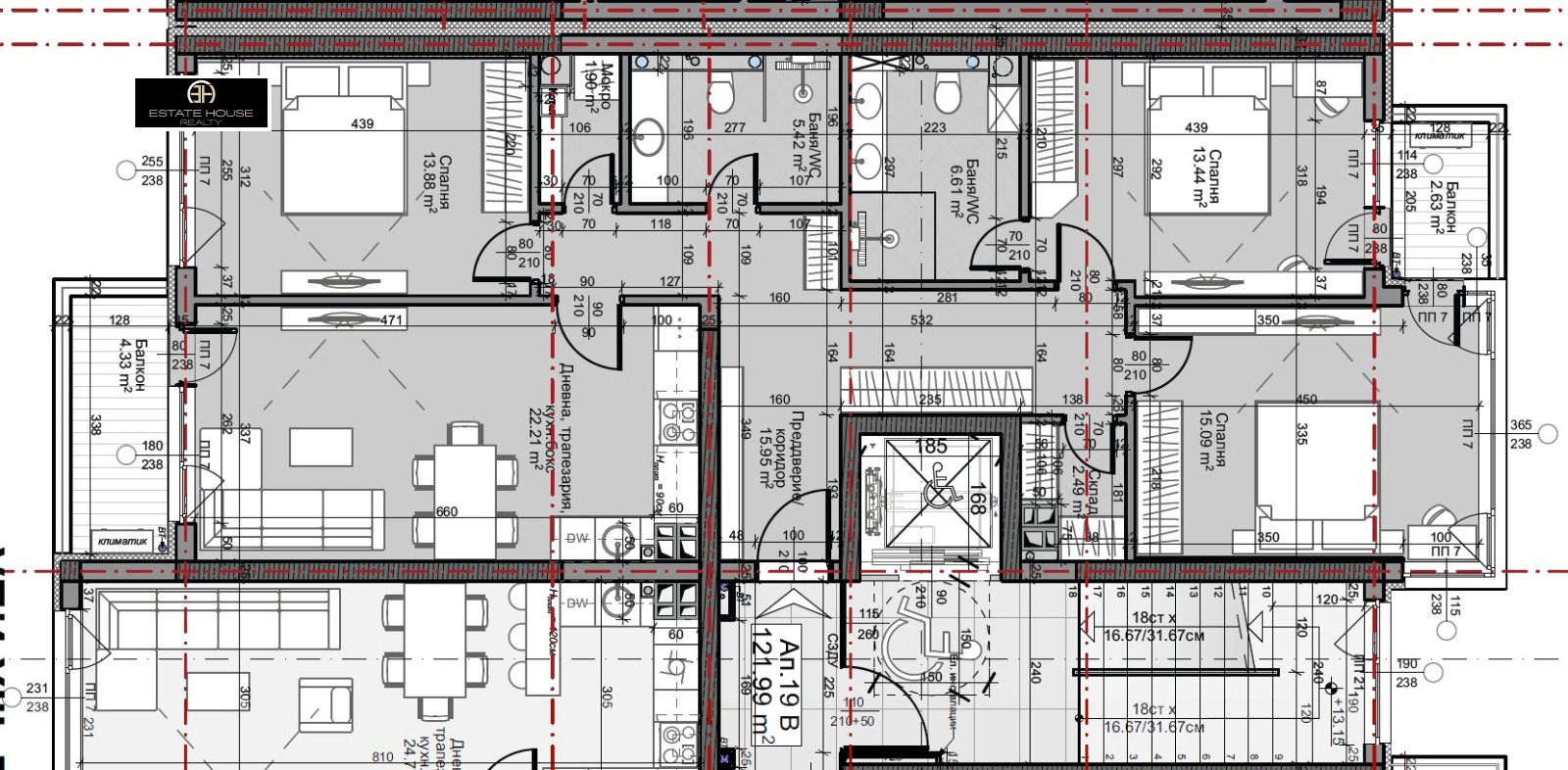 Апартаментът е с обща площ от 141.26 кв.м. и застроена площ от 122.14 кв.м. и се намира на 5-ти етаж в 10 етажен комплекс състоящ се от три входа А, Б и В.