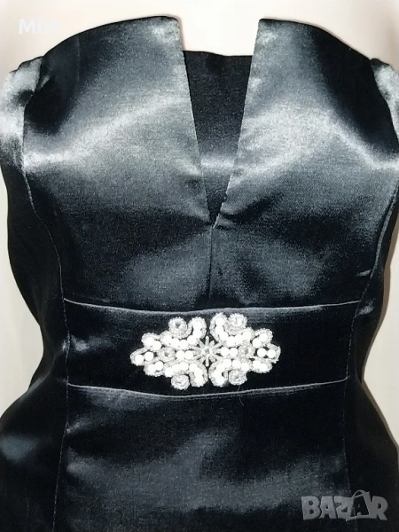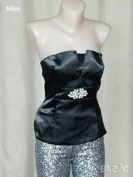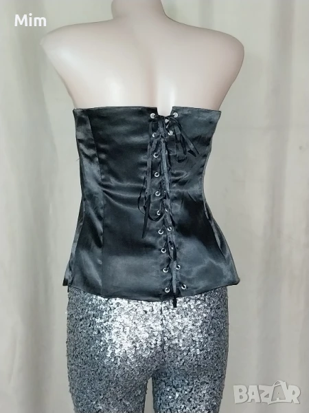 Черен сатенен корсет отпред с платка на бюста с 8 отвесни банели, отзад с капси с шнур за регулиране на размера по тялото, под бюста с цвете от бели мъниста и сребристи камъчета .Гръдна 45 см едностранно, 46 см едностранно, закопчаването е с цип странично.Няма забележки.