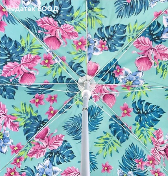 Плажен чадър с тюркоазен плат с големи тропически цветя и листа с цвят на фуксия и платнена чанта за носене с мрежа. Платът, който пада по периметъра (клап), е дълъг (8 см) за повече сянка.