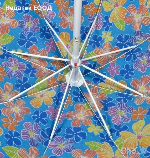 Ветроустойчив плажен чадър с двойно принтирана материя и калъф за носене от полиестер. Платът, който пада по периметъра (клап), е дълъг (7 см) за повече сянка.Диаметър: 200 см Спици: 8 броя, изработени от 3 мм стомана Рамка: Метална Плътна полиестерна тъкан 140G Има въздуховод Оси: Φ32 / 32 мм Разполага с механизъм за накланяне, който заключва и осигурява накланянето.