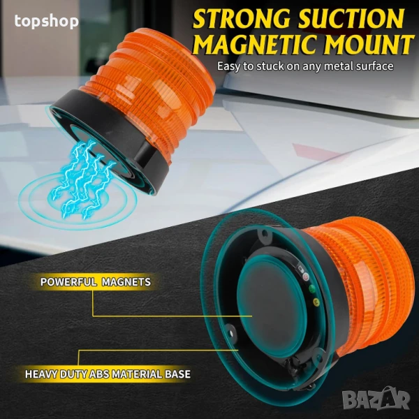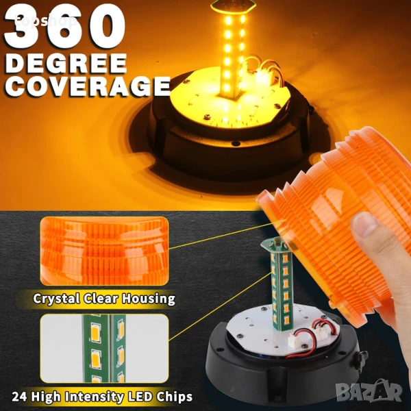 Кехлибарена мигаща светлина с 24 LED чипа с висок интензитет за 360-градусово супер ярко покритие, идеална за подобряване на видимостта при спешни случаи, пътна помощ или строителни работи. С кристално прозрачен корпус за максимална яркост, той остава видим ден и нощ. Акумулаторният дизайн предлага гъвкавост както с автомобилни, така и с домакински зарядни устройства, като показва ниска батерия с червена светлина. Предлагайки 17 светлинни модела, включително въртящи се, постоянно светещи и мигащи, той също така осигурява регулируеми нива на яркост и функция за памет за последния използван модел. Силната му засмукваща магнитна стойка осигурява лесно и сигурно закрепване към всеки метален покрив, което го прави идеален за широка гама превозни средства от SUV до снегорини. От съществено значение за професионалисти в областта на правоприлагането, теглене, сигурност, строителство и реагиране при извънредни ситуации.