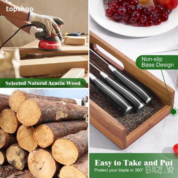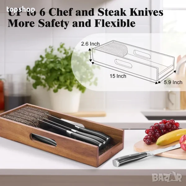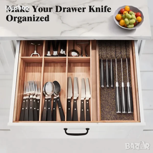 органайзер за чекмеджета за ножове разполага с меки, гъвкави коркови и гумени разделители, които предотвратяват допира на ножовете и надраскване един друг, като същевременно осигуряват организирано съхранение. Проектиран да пасва на различни кухненски чекмеджета (38,1x6,35x15,24 сантиметра), той помага да се поддържа чисто и подредено пространство. Изработен от издръжливо, естествено акациево дърво с красива текстура, той добавя нотка елегантност към всяка кухня. Не е необходима инсталация, а неплъзгащата се силиконова основа гарантира, че остава сигурно на място за лесно съхранение.