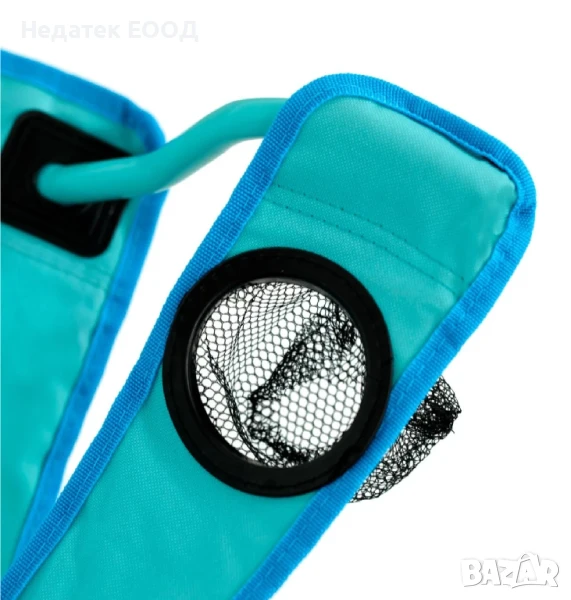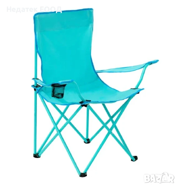 Сгъваем къмпинг стол в тюркоазен цвят със светлосин кант, стоманена рамка, отвор за подлакътници 84 см и издръжлива 600D оксфорд материя с PE покритие. Има поставка за чаша на дясната дръжка. Сгъва се за лесно съхранение и има чанта за носене с дръжка.