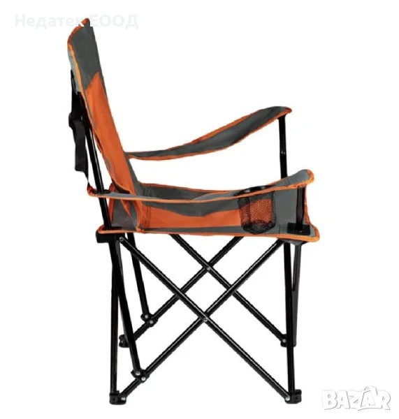 Сгъваем къмпинг стол със здрава рамка с пръти 0.8 мм, размах на подлакътниците 80 см и издръжлива оксфордска материя 600 D с PE покритие. Има поставка за чаша на дясната дръжка и перфорирана част в средата на седалката. Сгъва се за лесно съхранение и има чанта за носене.