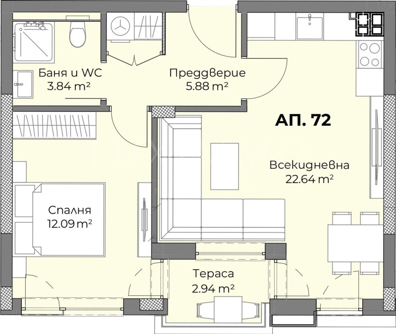 Имотът с обща площ от 67.11 кв.м е разположен на 8-и етаж от 9.