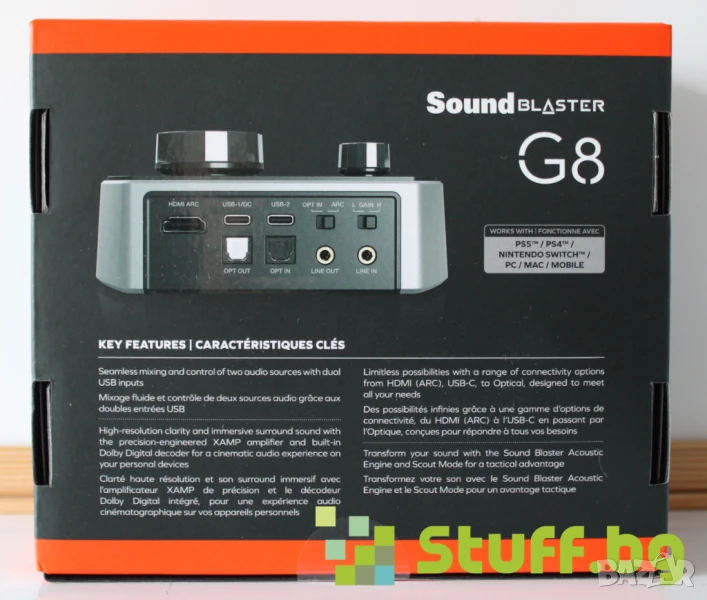 Hi-Res Gaming USB DAC и усилвател. Sound Blaster G8 осигурява сладкия звук на победата с двоен USB аудио вход и миксиране, най-доброто в класа си висококачествено 32-битово възпроизвеждане и собствен XAMP усилвател за слушалки. Вашият универсален хъб за управление на вашите устройства: свържете вашата игрова конзола, мобилно устройство, компютър и други чрез USB-C, след което безпроблемно миксирайте и предавайте аудиото си към софтуер за стрийминг и платформи. А с HDMI ARC, Sound Blaster G8 се вписва идеално в конфигурацията на вашата конзола.