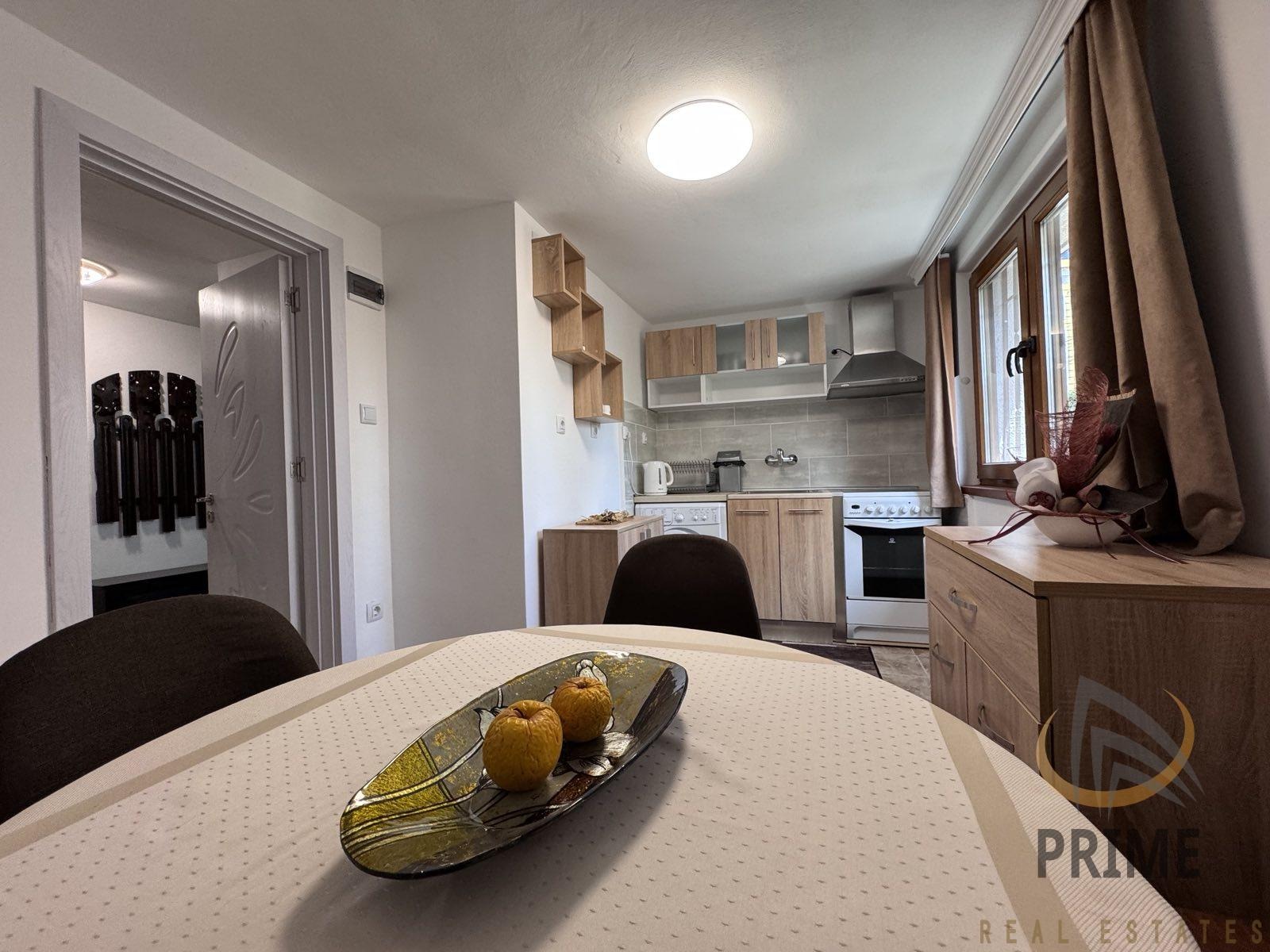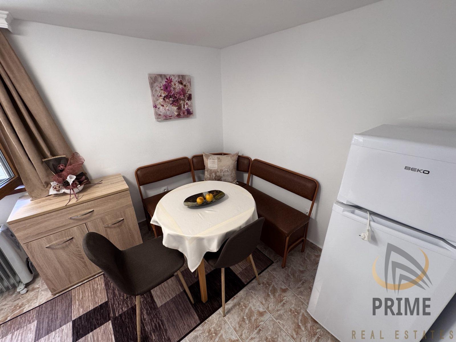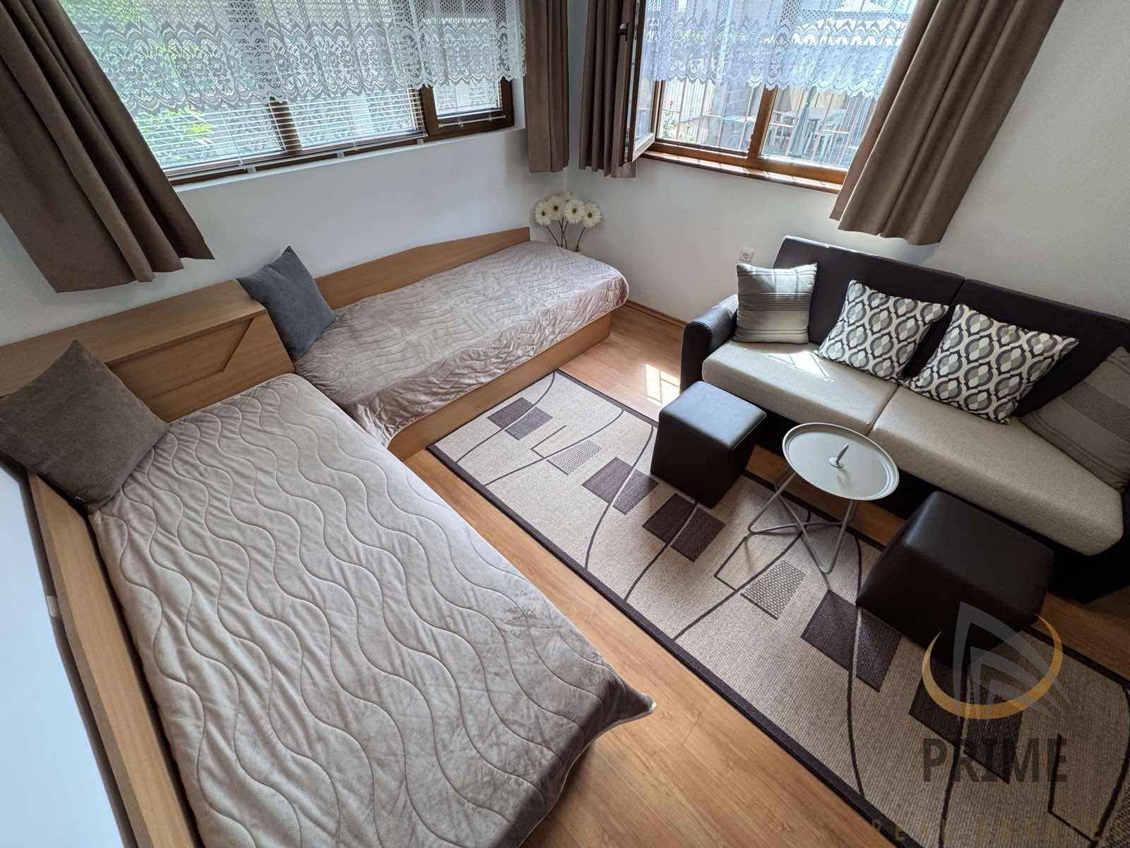 РАЗПРЕДЕЛЕНИЕ: Коридор, кухня с трапезария, хол с към обособен за спалня с две единични легла и баня с тоалетна.
