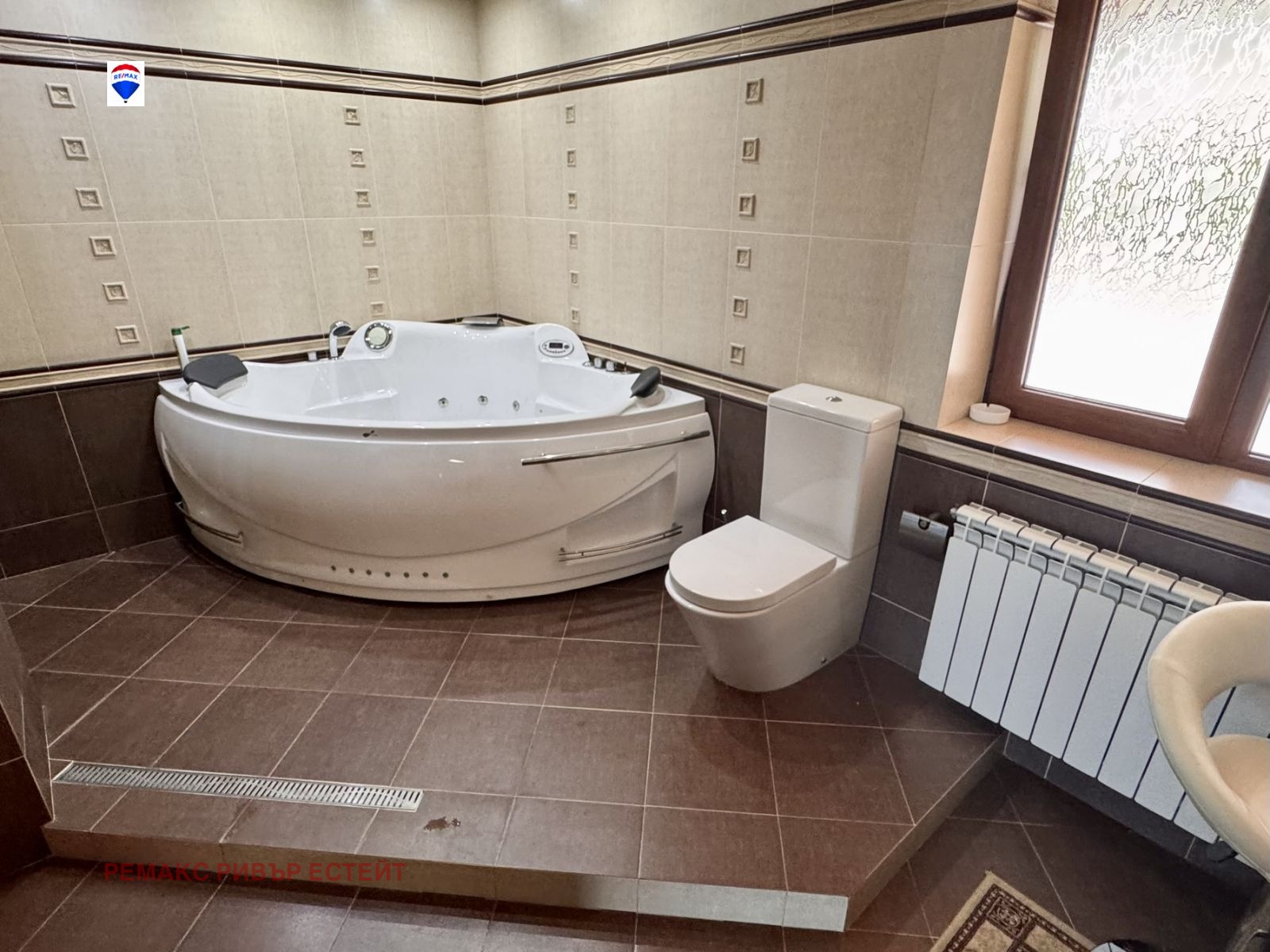 Самостоятелна баня с джакузи, душ панел и прозорец, отделна детска стая, перално помещение, гардеробна за официални и ежедневни дрехи.
