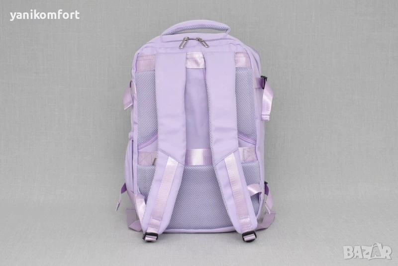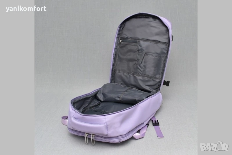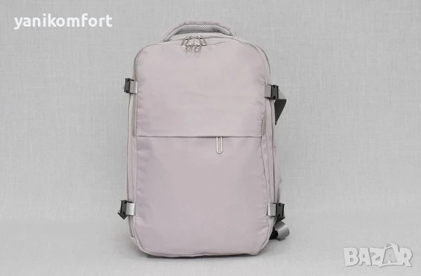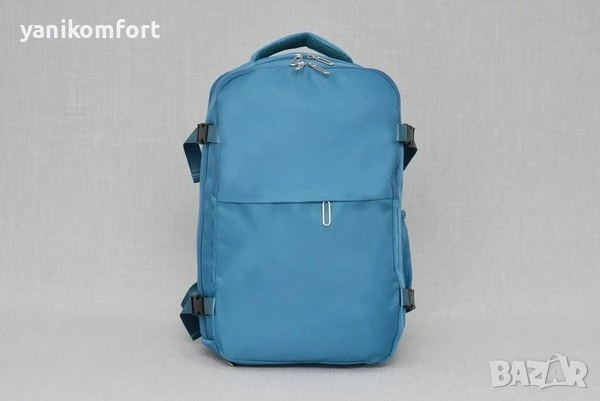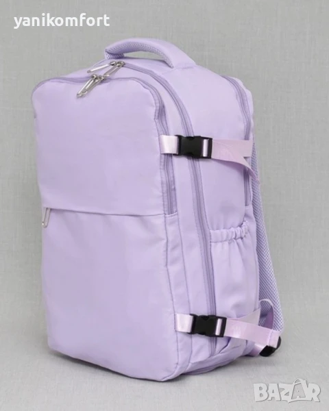 Раница за ръчен багаж от текстил с три отделения и джоб за обувки на дъното.Първото е водоустойчиво, основното отделение има шест джоба, двата са с цип.С един лицев джоб с цип, един страничен джоб, джоб с цип на гърба и дръжка за ръка.Раницата е укрепена с коланчета, има регулируеми презрамки, уплътнен гръб и се прикачва към дръжка на куфар.Размери: 40 х 30 х 20 см. 40/30/20, раница, раници, магазин за раници Русе,магазин за чанти Русе Яни Комфорт, Авио раница, раница за самолет, пътническа раница, пътна раница, раница за ръчен багаж, раница за пътуване, Wizz Air, Ryan air