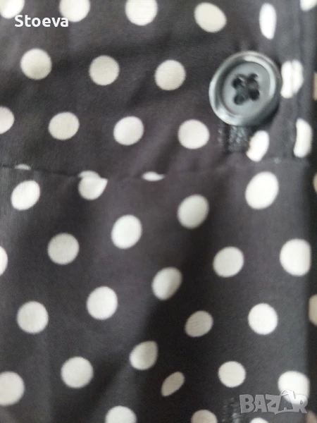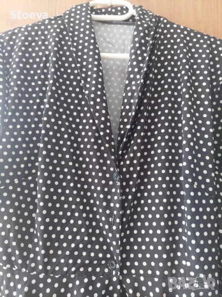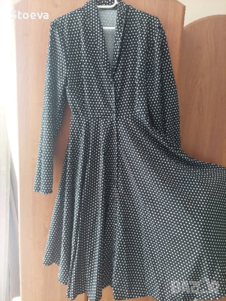 Дамска елегантна рокля- наситено черно на точки. Пълен клош. Дълъг ръкав, копчета отпред по дължината, остро деколте с шал яка.