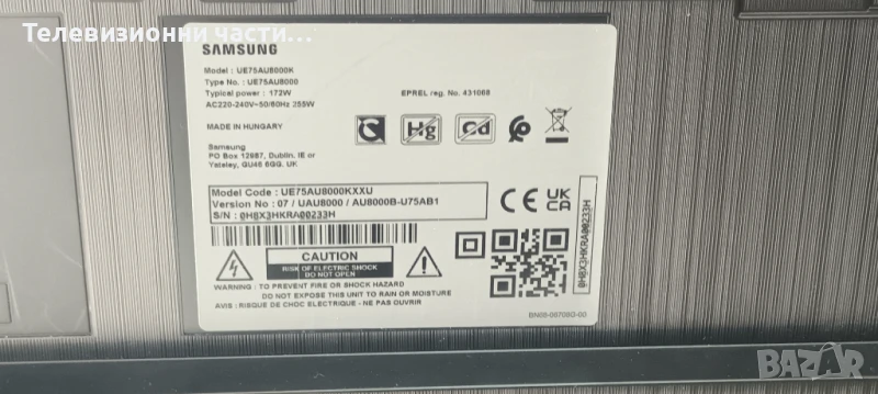 Samsung UE75AU8000K със счупен екран CY-SA075HGHV4H/BN41-02844B BN94-17252E/BN44-01112A/S1AB-750SM0