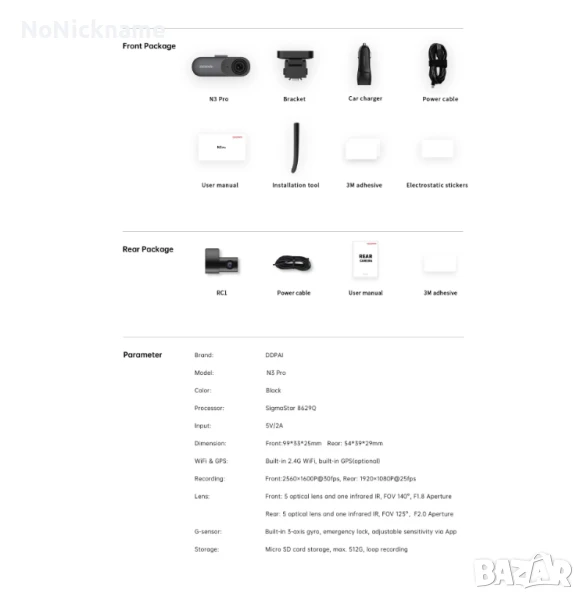 DDPAI Mola N3 Pro GPS Dash Camera 2.5K Видеорегистратор за кола с предна и задна камера