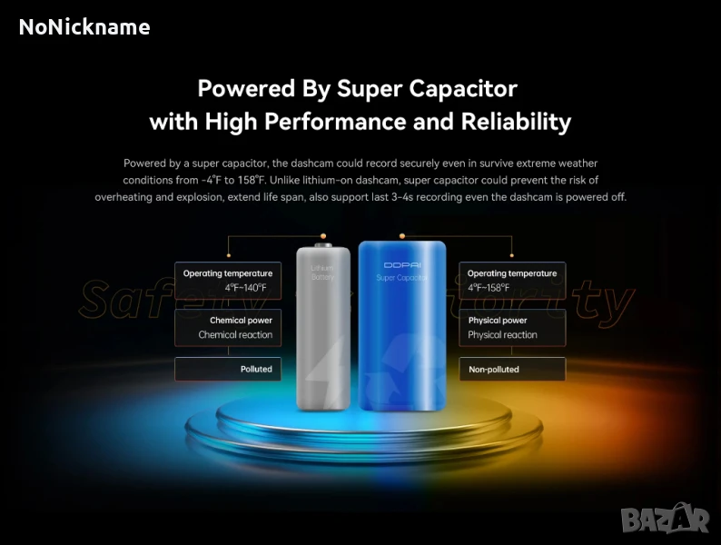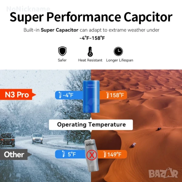 видеорегистраторът може да записва сигурно дори при екстремни метеорологични условия от -20°C до 70°C. За разлика от литиево-йонните видеорегистратори, суперкондензаторът може да предотврати риска от прегряване и експлозия, да удължи живота на видеорегистратора, а също така поддържа запис в продължение на 3-4 секунди, дори когато видеорегистраторът е изключен.