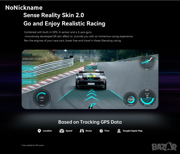 • Sense Reality 2.0: Насладете се на реалистични състезания в комбинация с вграден GPS, G-сензор и 3-осен жироскоп, иновативно разработеният SR 2.0 skin ефект ви осигурява завладяващо състезателно изживяване.