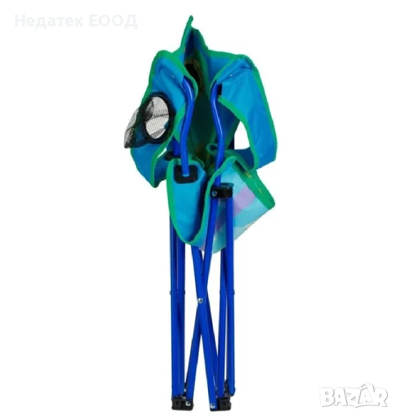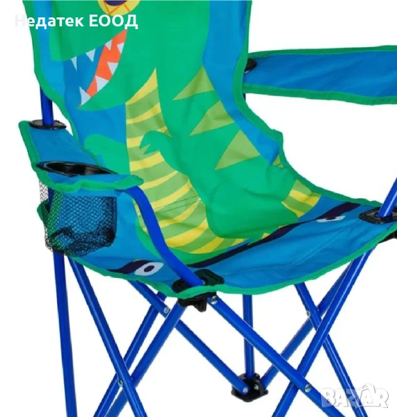 Сгъваем къмпинг стол за деца, със здрава рамка с пръти 0.7 мм, отвор за подлакътници 56 см и издръжлива оксфордска материя 600 D с PE покритие. Има поставка за чаша на дясната дръжка и дизайн с динозавър. Сгъва се за лесно съхранение и има чанта за носене.