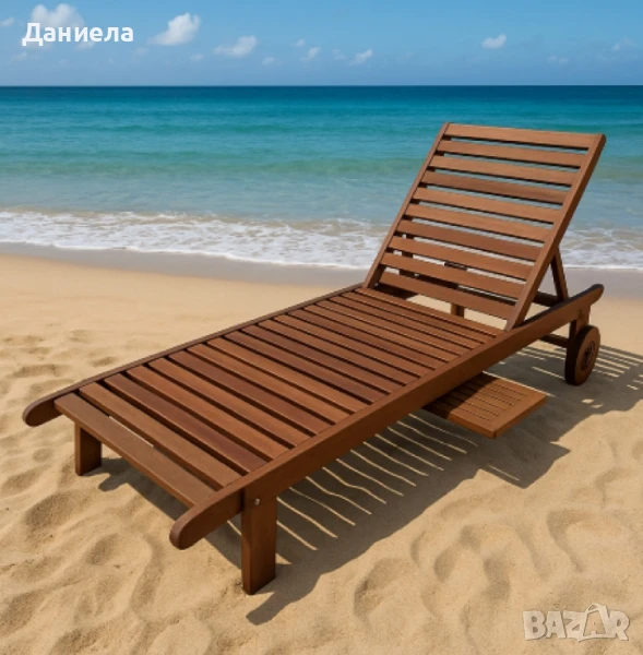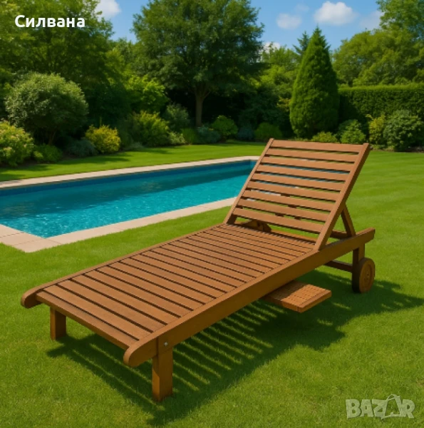 Тип продукт: Шезлонг;Шезлонгът е с класически, линеен дизайн, изцяло изработен от естествено дърво с обработка от тиково масло за допълнителна защита. Дървесната структура е умерено груба с видими преплетени зърна, което придава автентична текстура и натурална естетика.Размери: 194x71x80 см;Максимално натоварване: до 100 кг;Материал: дърво Meranti / Shorea;Обработка: тиково масло;Допълнителни елементи: вградена масичка, 2 колела;Регулируема облегалка.