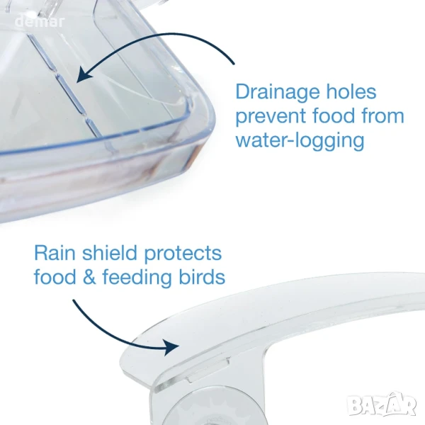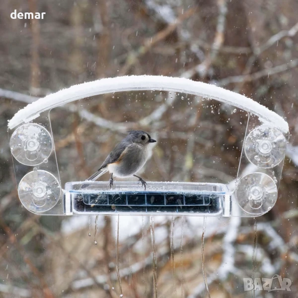 Тази хранилка за птици е снабдена със здрави вендузи за сигурно захващане на всеки прозорец, дори при лошо време, и издръжлива конструкция от прозрачен акрил за наблюдение на птици отблизо. Устойчив на атмосферни влияния капак предпазва птиците и семената от дъжд и сняг, а плъзгаща се тава позволява бързо пълнене и лесно почистване. Вградените дренажни отвори предотвратяват натрупването на вода, поддържайки семената сухи и свежи.