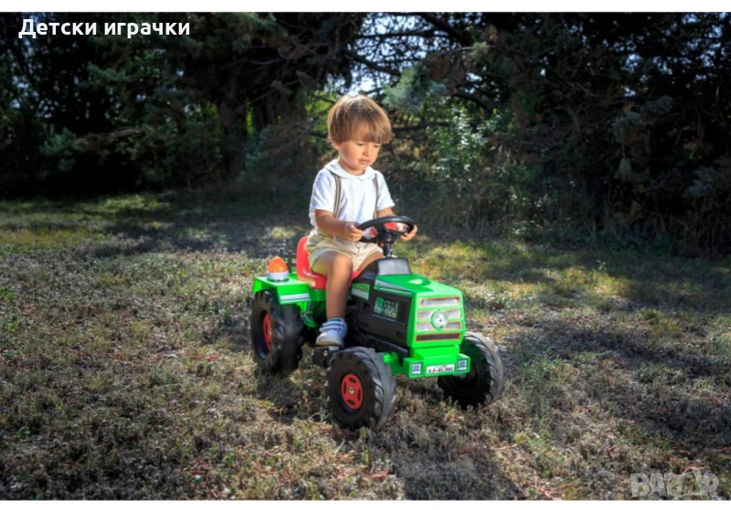 електрически трактор. Развива до 2 километра в час. Включва сирена, която излъчва светлина и звук. Дизайнът му, детайлен и реалистичен, отразява легендарната марка трактори John Deere.