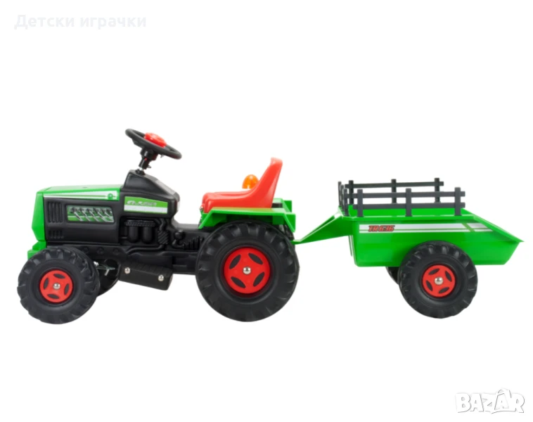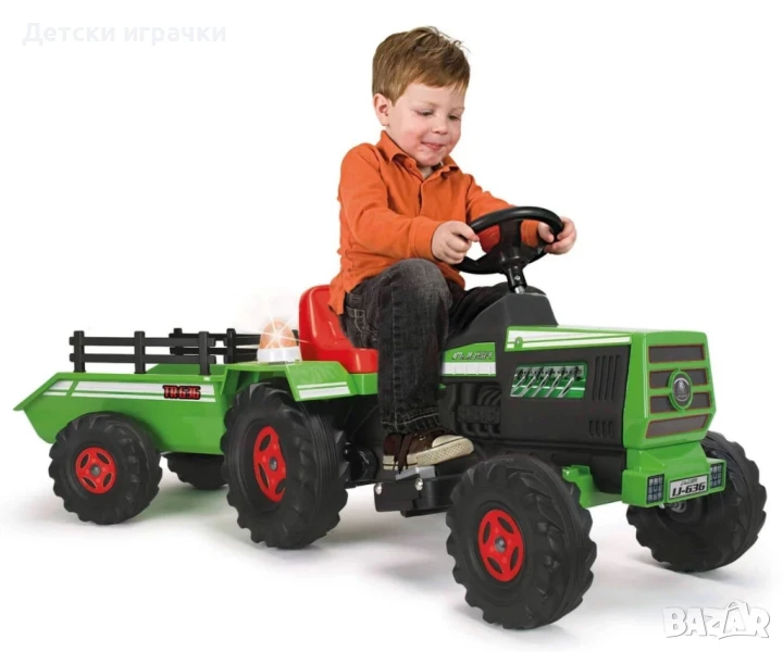Неговото ремарке, което се доставя с превозното средство и се прикрепя към задната част на трактора, позволява още по-голямо забавление, като децата могат да транспортират играчките си от едно място на друго.