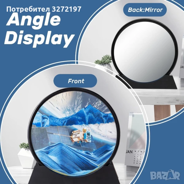 Движеща се пясъчна арт картина с огледало, 3D динамично пясъчно изкуство, течни движещи се пясъчни пейзажи, релаксиращ декор за настолен плот за дома и офиса - синьо пространство,12 инча