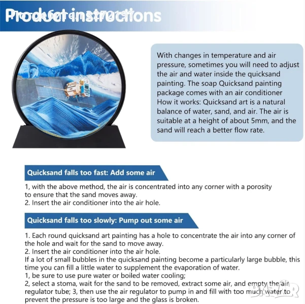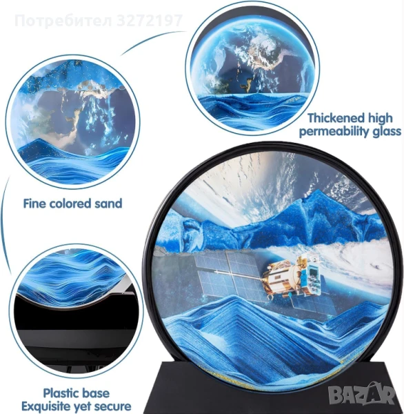 Стъклен материал: Изработено от висококачествено стъкло, това произведение на изкуството от пясък предлага издръжливост и ясен изглед към движещите се пясъци.