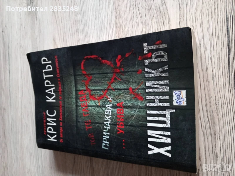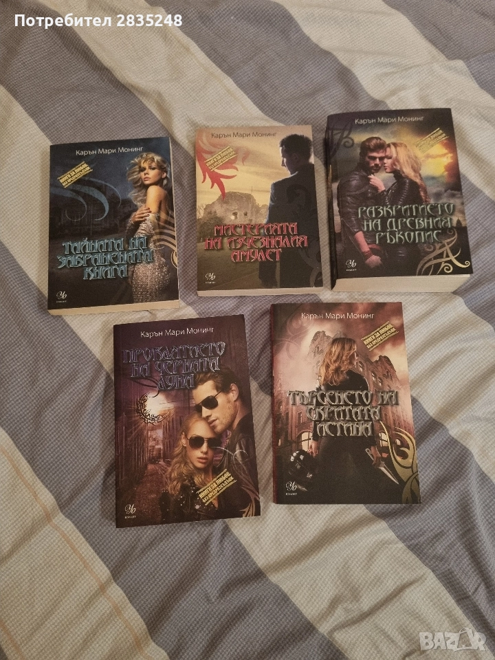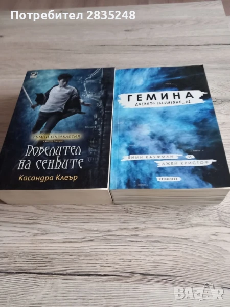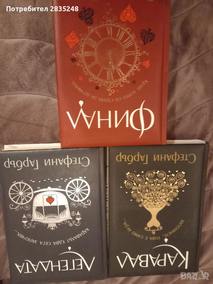 Продавам следните книги, като цените са написани след всяка книга. Империя на бури със старите корици-110лв-нова, Ив сен Лоран-Лоранс Бенаим-60лв отлична, Хищникът от Крис Картър-80лв, Плитката-Летисия Коломбани-85лв, Бледият конник от Бърнард Корнуел-65лв, Наследството на черния кинжал книга 2 Кръвен обет-70лв, Повелител на сенките от Касандра Клеър-80лв, трилогията " Последното кралство " от Бърнард Корнуел-170лв, Проклятието на Воронина-Цветелина Владимирова-лимитирано издание с цветни порезки и твърди корици-170лв, Нож от блянове със старите корици-100лв, Среднощни кули със старите корици-90лв, Буря се надига със старите корици-180лв, Искам те-Федерико Моча-55лв-отлична, Талисманът от Стивън Кинг-70лв-отлична, Веровещица-Сюзън Денърд-60лв, Крал на пепелища от Реймънд Фийст-70лв, Лука Модрич-Моята игра-70лв, Обсидио от Джей Кристоф-70лв, Гемина от Джей Кристоф-70лв, Полукрал-Джо Абъркромби-100лв, трилогията Каравал с твърди корици от Стефани Гарбър-200лв, 5-те книги от поредицата Треска на Карън Мари Монинг-200лв, Шерлок холмс-пълно издание на Труд от Артър Дойл-нова 130лв, трилогията Дивергенти-90лв, колекция Демет Алтънйелеклиоглу-330лв, Синовете на великата мечка-колекционерско издание с твърди корици-160лв, Кралица на въздух и мрак от Касандра Клеър-110лв, Трилогията Барутният маг от Браян Маклелан-100лв, Колелото на времето със старите корици от 1-ва до 10-та част в едно добро състояние 150лв, Космическият код-Зекария Сичин-60лв, Здрач-пренаписан юбилейно издание-160лв-Стефани Майър-200лв, Стъкленият трон със старите корици от Сара Дж Маас/всички книги -330лв.