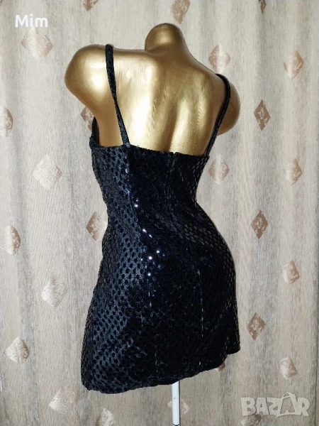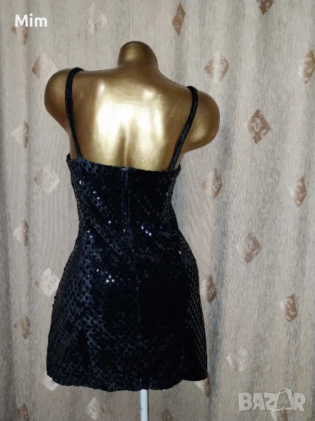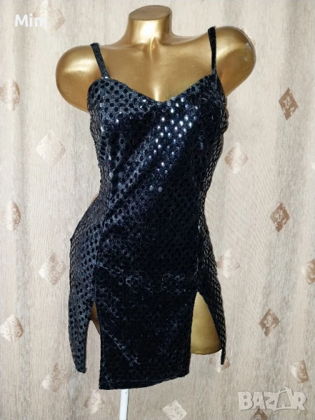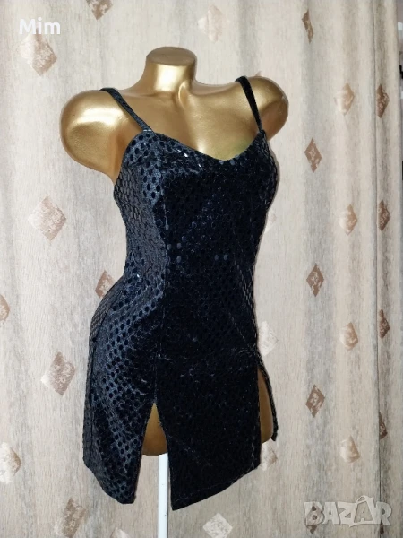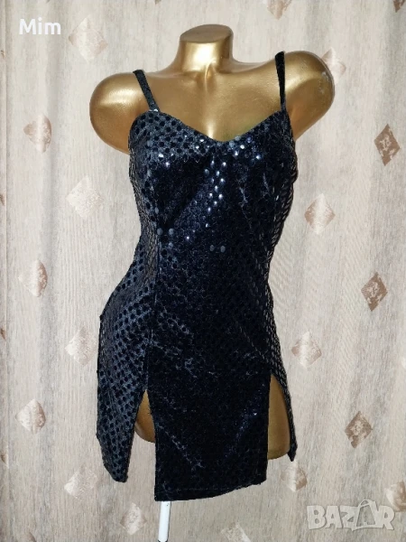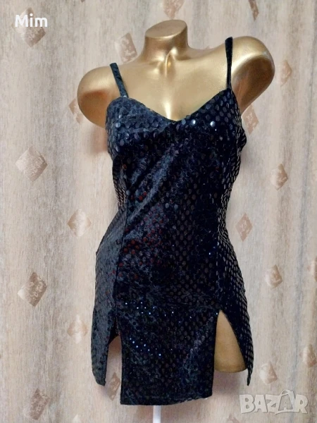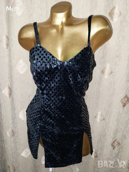 Черна рокля от плюш с залепени капки наподобяват на лак с отблясък с две цепки над бедрото ,с презрамки, закопчаването е отзад с цип, гръдна 44 до 47 см едностранно, талия 37 до 40 см едностранно, ханш от 50 зо 55 см едностранно, дължина 76 см Няма забележки.